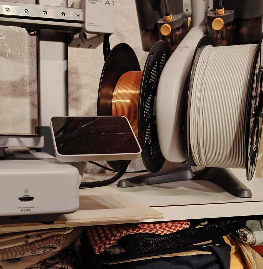 partie du meuble vintage, portes ouvertes (2 portes sur 4, sans compter les tiroirs!) et aperçu de l'imprimante 3D et de son A.M.S.